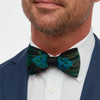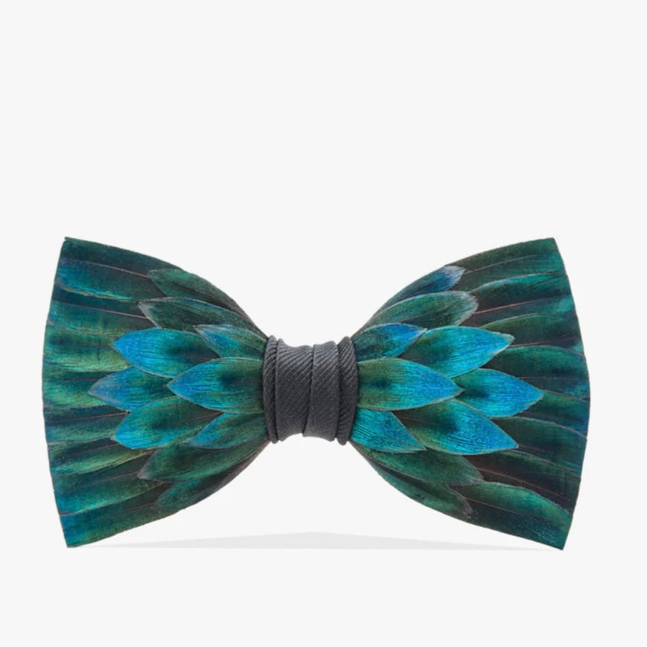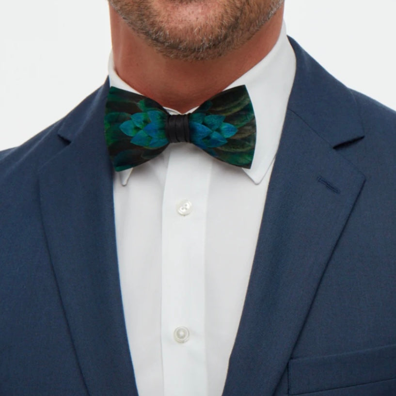 Chisolm is crafted with iridescent blue and green peacock feathers that are each individually selected, shaped, trimmed and laid. The center wrap of this dark teal bow tie is black grosgrain.
