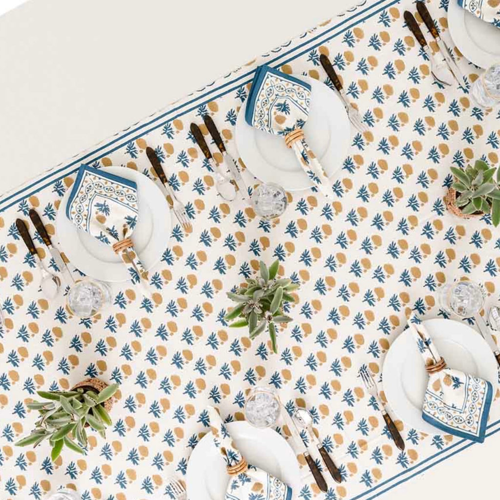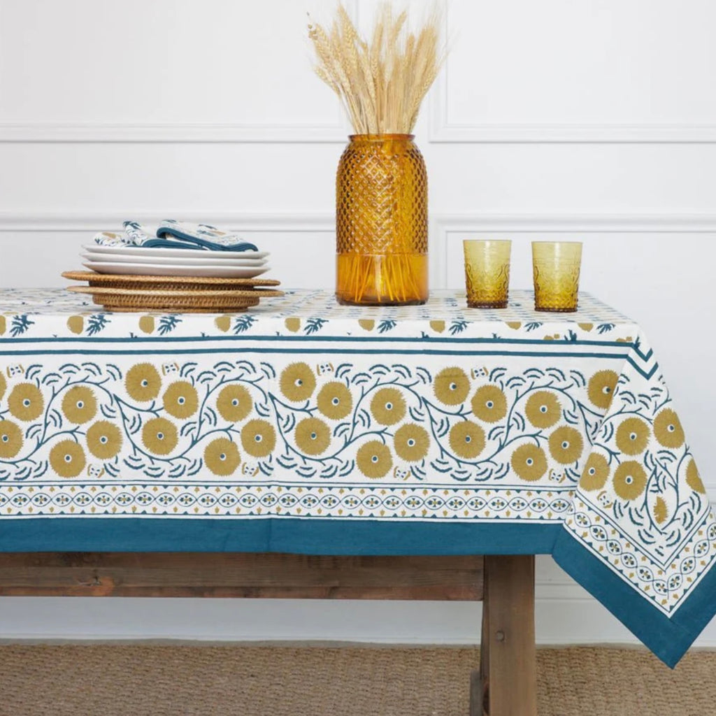 Printed by hand using rich dyes and carved wooden blocks to achieve a one-of a-kind design, our Gaya Teal & Marigold Placemats create a vivid and opulent table for your seasonal gatherings