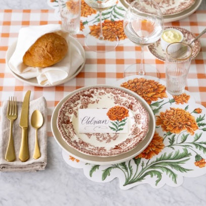 The Die-cut Marigold Bouquet Placemat frames your plate in autumn colors, from rich oranges to stunning sage. Inspired by textile printing, the bold florals and swirling leaves are a gorgeous foundation for fall and Thanksgiving tables.