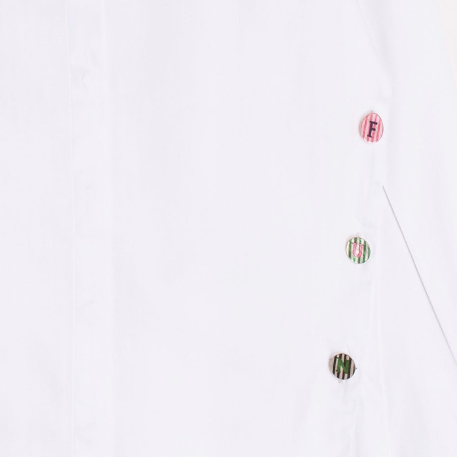 White straight-cut shirt with a classic shirt collar. Hidden front button closure. Features decorative striped buttons on both sides, forming the word "FUN" with bold letters. Straight hem with small side slits. Structured cotton-blend fabric with clean finishing.
