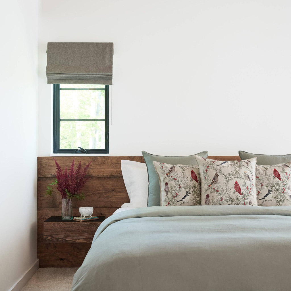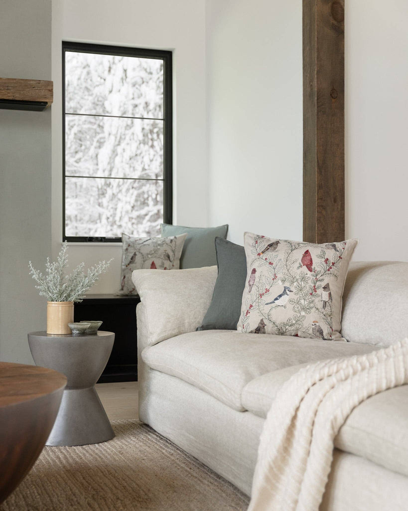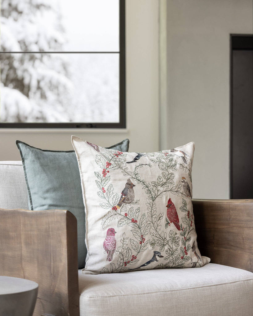 Add color to and cheer to your home this season with embroidered birds and berries. Our Winter Birds design brings together a feathered flock including a Blue Jay, Cardinal, Titmouse, Golden-Crowned Kinglet, Purple Finch, and Cedar Waxwing. Each bird is perched in a thicket of seasonal greens composed of holly, boxwood and snowberry.